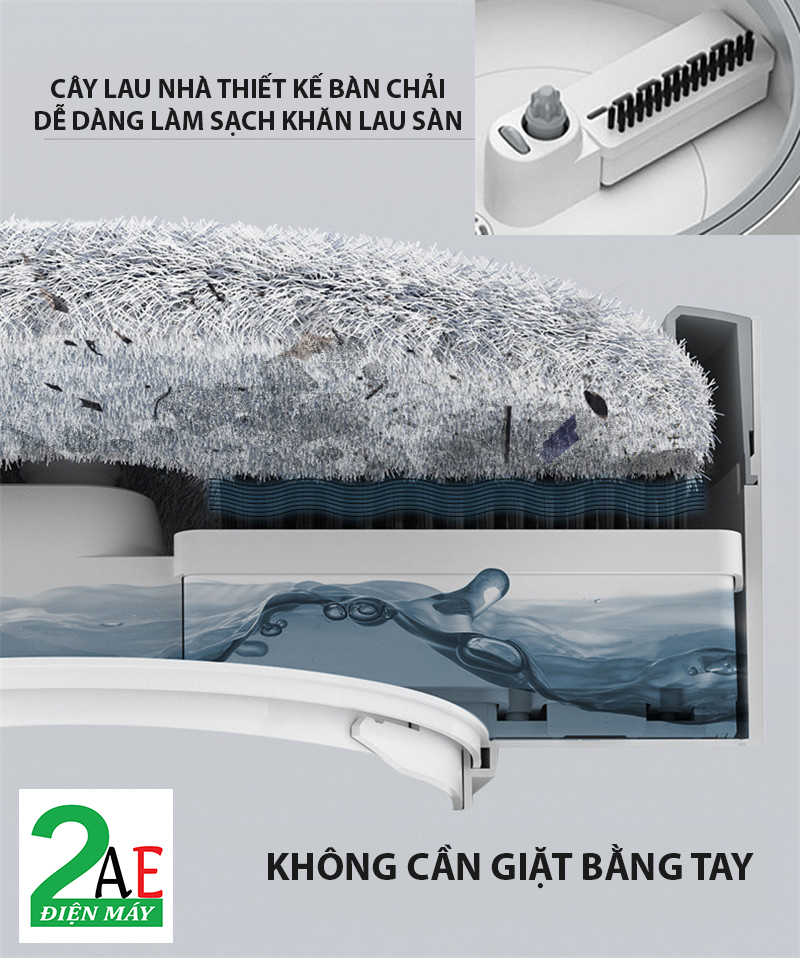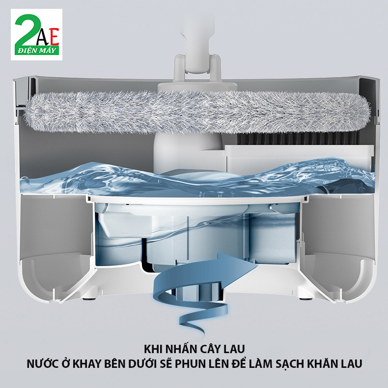 - Cắm cây lau vào thùng chứa, dùng lực ấn để xoay cây lau, nước tự động phun lên làm ướt và bàn chải sẽ làm sạch bông lau.