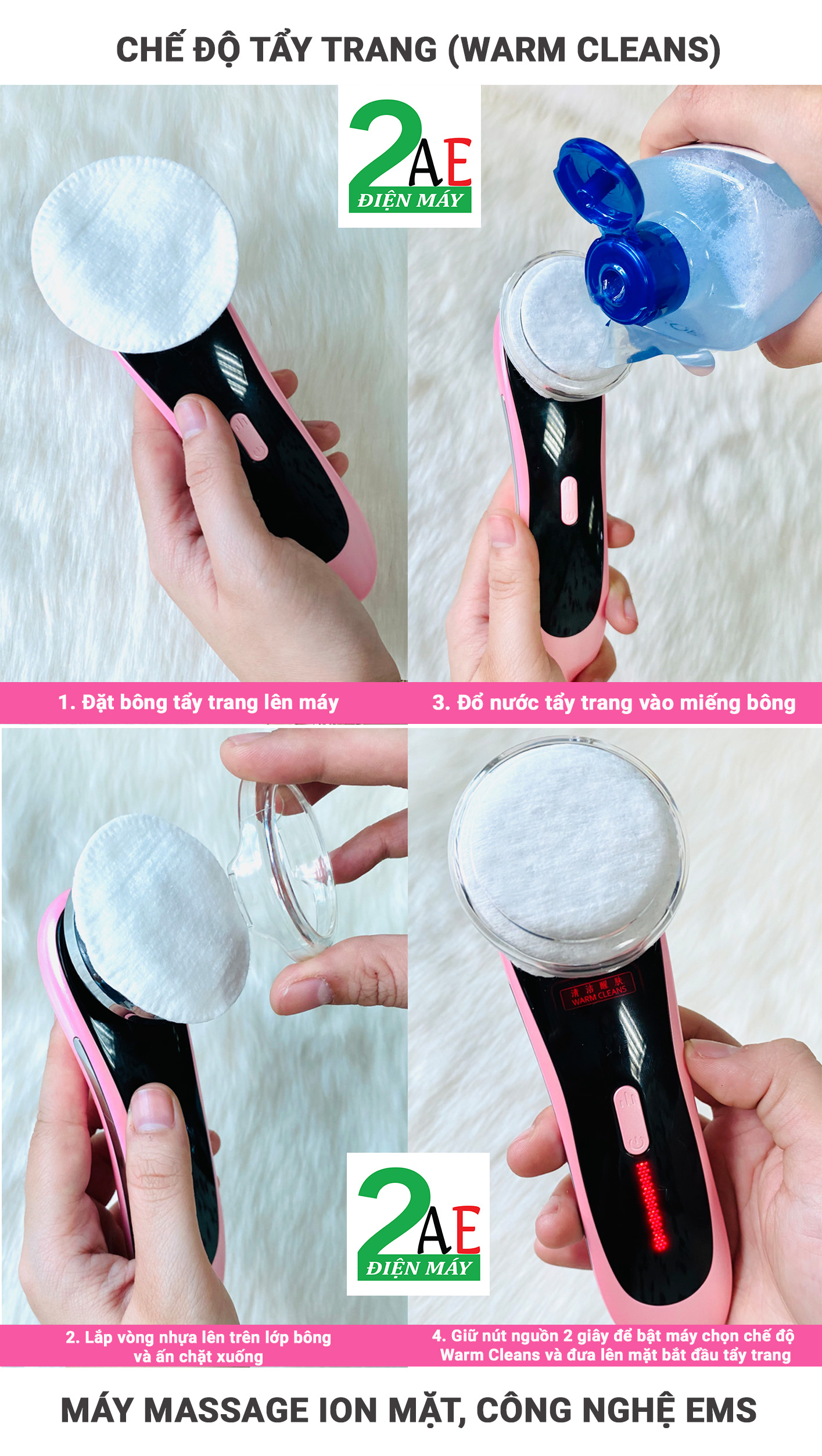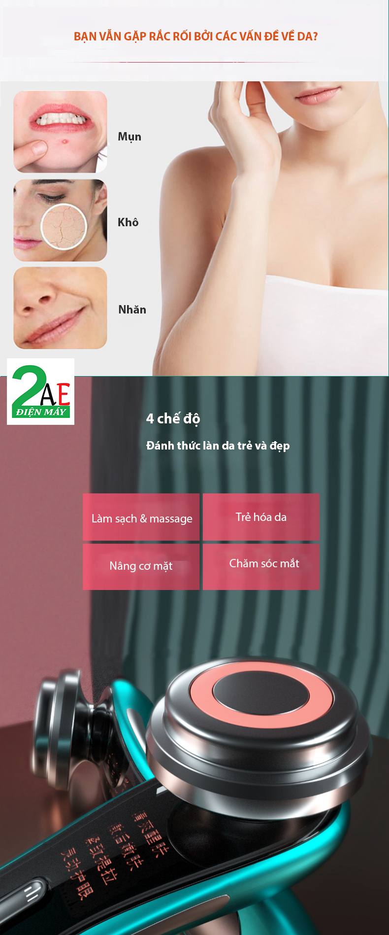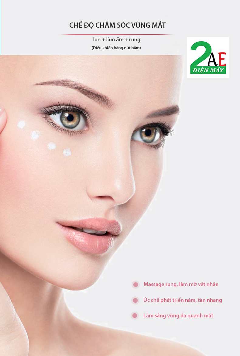 Có 4 chế độ làm việc: Làm sạch sâu/ Trẻ hóa da/ Làm săn chắc và nâng cơ/ Massage mắt