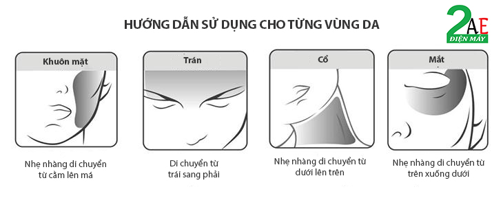 Khu vực sử dụng: mặt, cổ, trán, cằm, vùng da quanh mắt (Tránh thiết bị vào mắt, khi dùng quanh mắt, cần nhắm mắt lại)