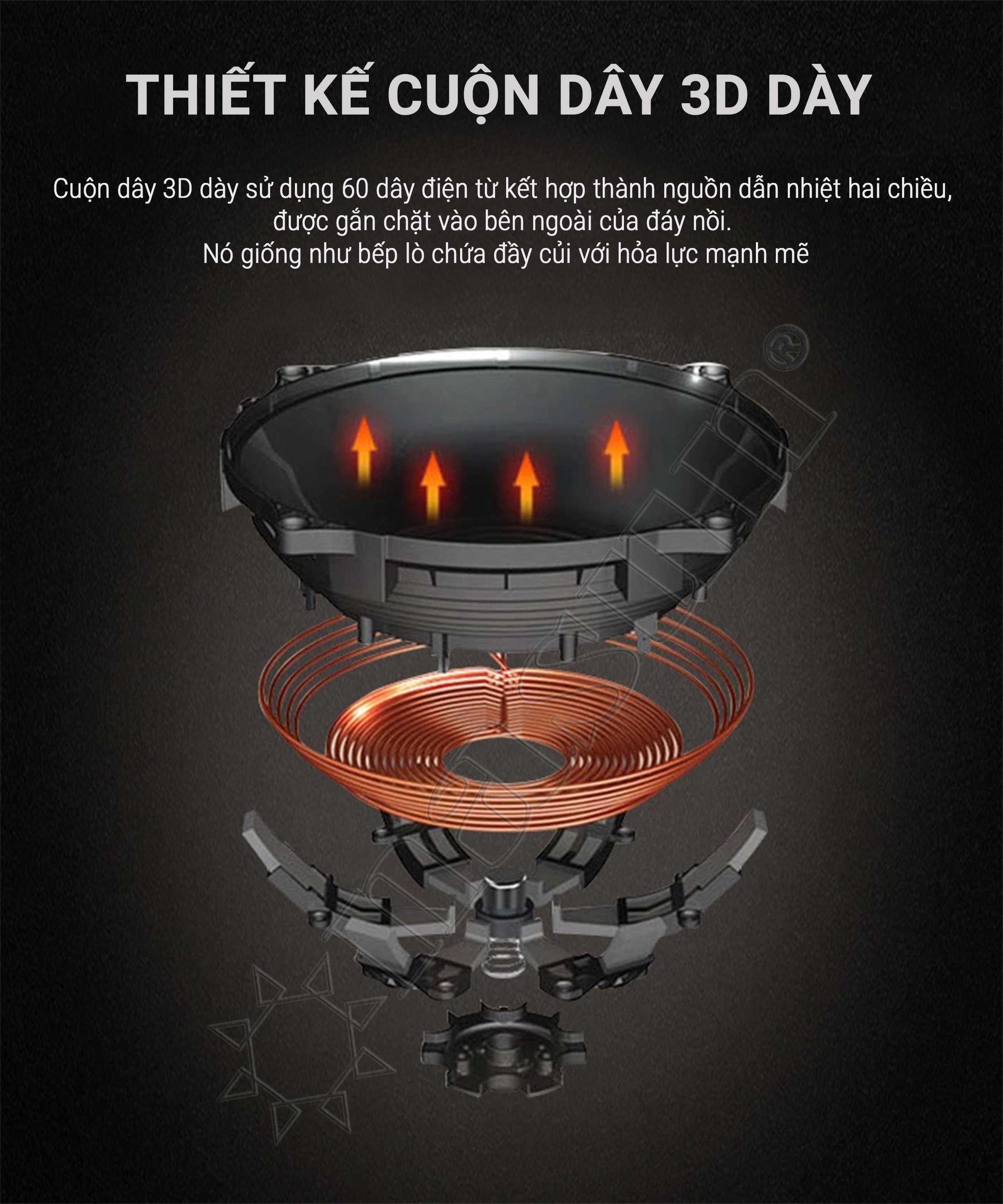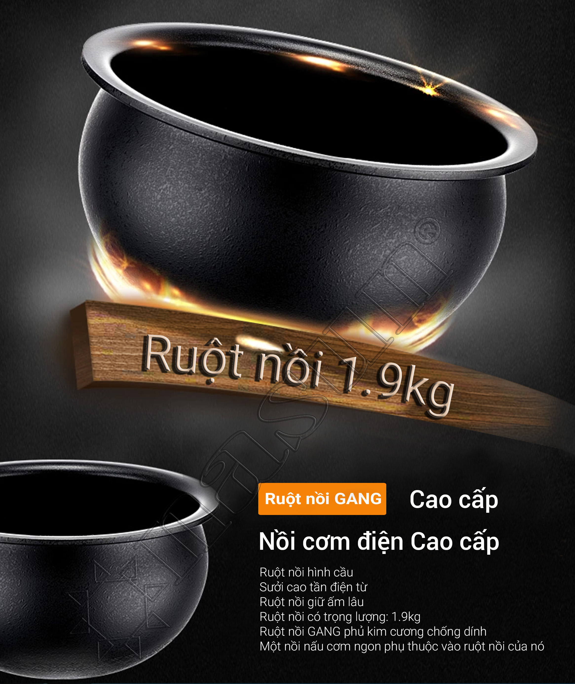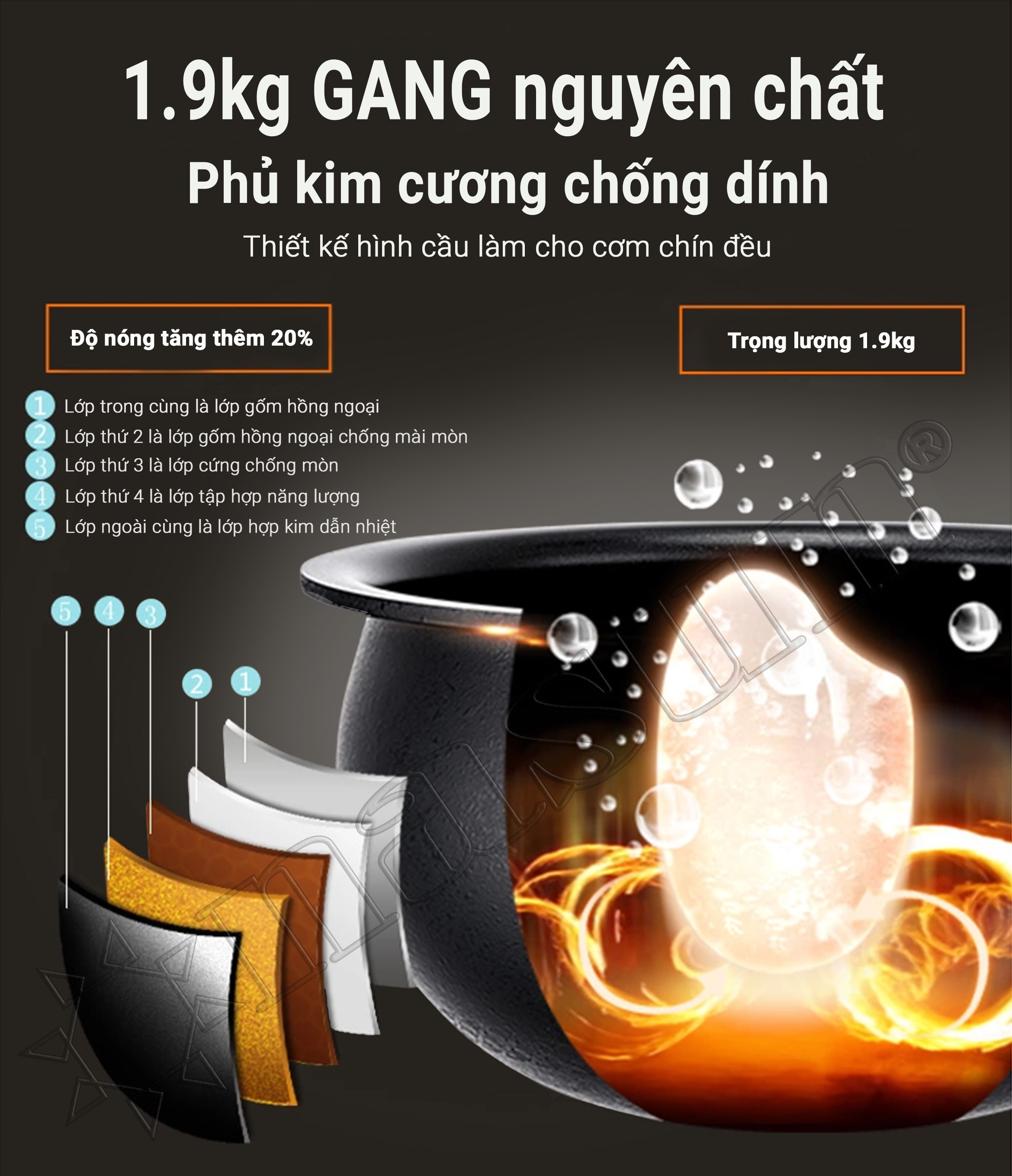 * Ruột nồi bằng GANG dày, phủ kim cương chống dính